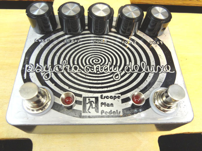 The Psycho Andy Deluxe takes that concept to heart with its op amp distortion / overdrive circuit with an asymmetrical clipping section feeding into a nasty 60s style velcro fuzz. Both circuits are completely independent of each other, so you can set your distortion / overdrive section to a nice crunchy rhythm sound, and then kick in the fuzz section for searing leads. Another possibility is having the fuzz section set to a controlled setting to play backing riffs and kick in the drive when you need more oomph for a section of the song. Or say you just need a good distortion. Or you want just a nasty fuzz for those 60s garage tunes. This pedal does all that, and more. The fuzz section features a variable scoop section for getting even more varied tones. This pedal is just too much fun. I take no responsibility for mornings spent jamming on this pedal when you ought to be at work already. Trust me, it happens. It's just too much fun.
